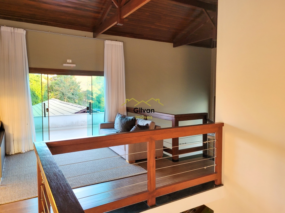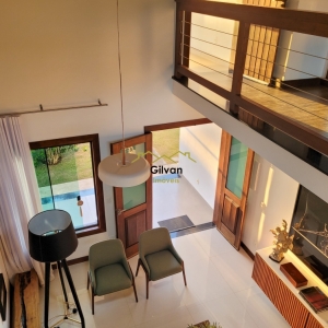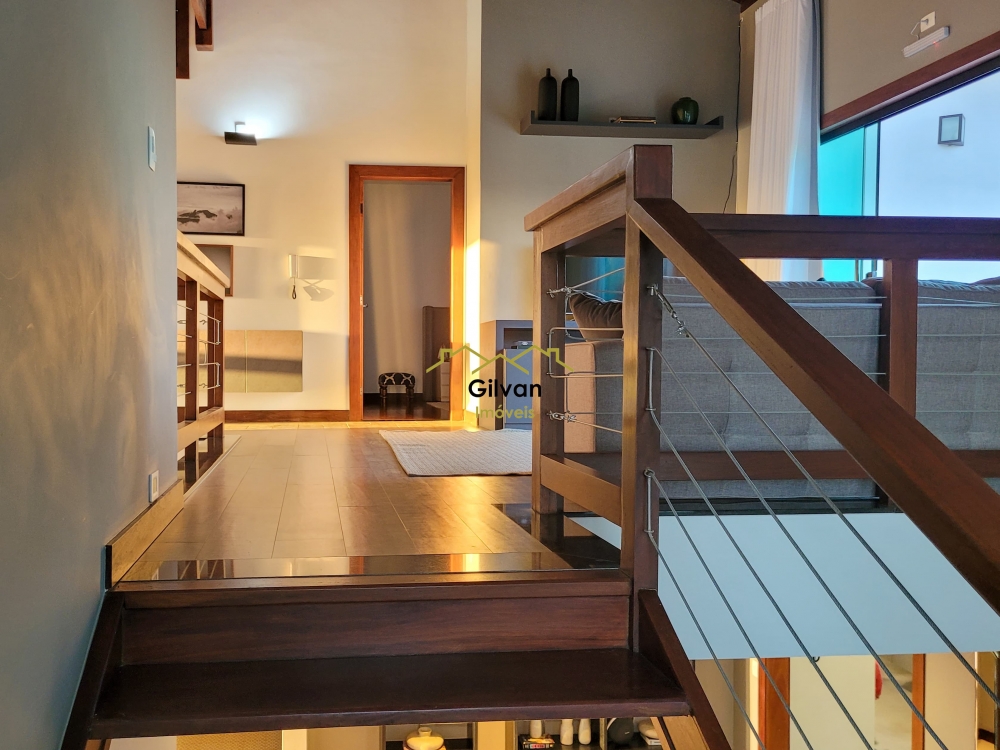 Pé direito com hall no ambiente superior tendo sacada em varanda frontal e ao fundo.
