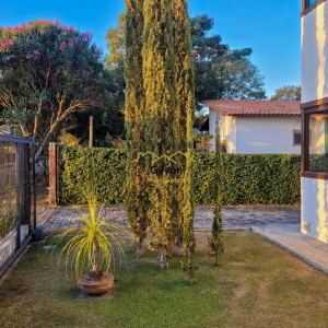 Área externa com jardim e gramado.